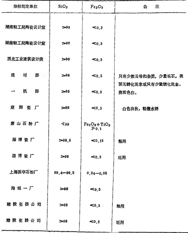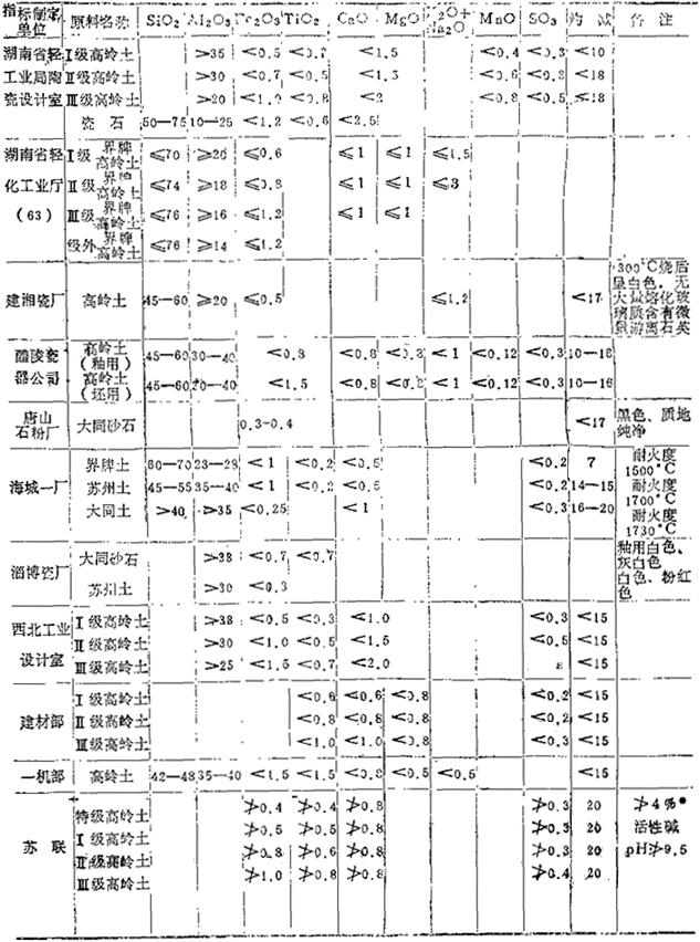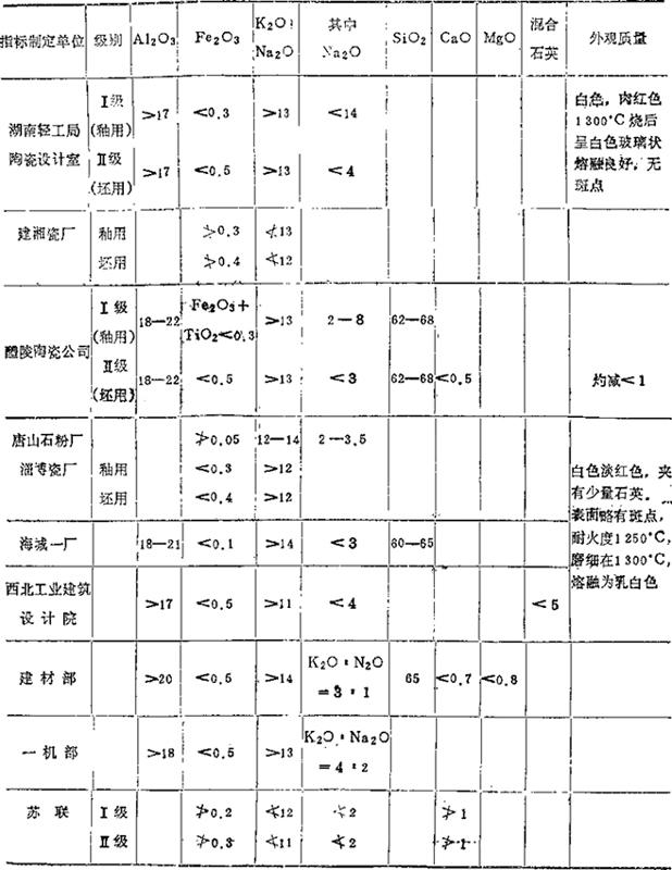 3.日用细瓷对主要原料的质量要求 日用细瓷对主要原料的质量要求,详见表1-4至表1-9所列(摘自“湖南省轻工业局陶瓷设计室汇编资料”)。 表1-4 对高岭土的质量要求 (重量%)