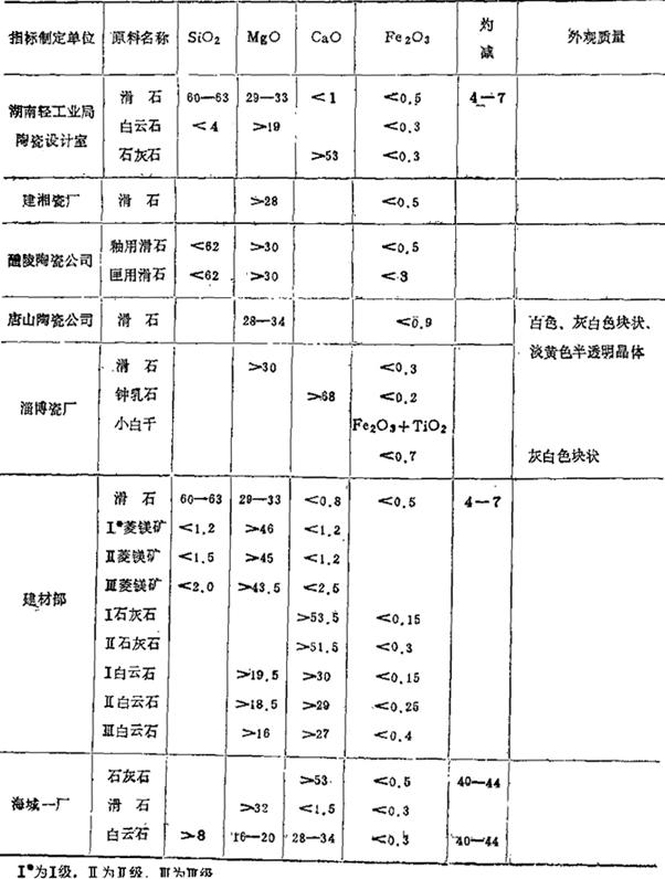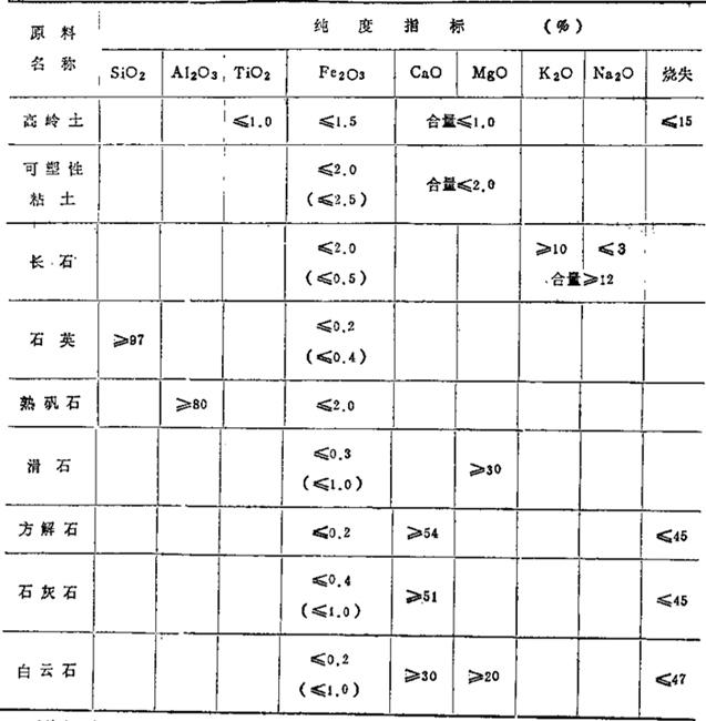Ⅰ*为Ⅰ级,Ⅱ为Ⅱ级,皿为皿级 4.普通高压电瓷对主要原料的质量要求 (1)对适用于普通电瓷的矿山原料化学成分的要求,参见表1-10。表中Fe2O3成分指标,在可塑性粘土带括号的数值,只适用于坯料中用量少的高可塑性粘土,其他原料带括号数值只适用于加工后的粉料。 表1-10 电瓷用矿物原料的化学成分纯度指标