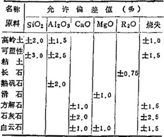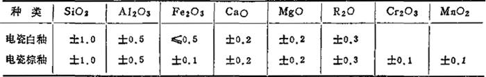 (摘自同上) 3.电瓷坯料、釉料化学成分允许偏差值,参见表1-75和表1-76有关规定。 表1-75 坯料的化学成分允差值 (重量%)
