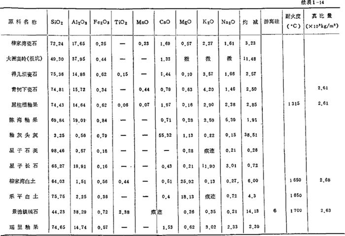(摘自JB/DQ7079-83) 注:①矿物原料的外观质量,包括原矿的外观质量和在生产窑焙烧后的外观质量; ②测定长石熔融温度范围的试样,采用小三角锥或Φ5×5mm圆柱体: ③测定铁粉量应取样5kg,用马蹄形磁铁吸铁法。 (二)我国主要产瓷区建筑卫生陶瓷及日用瓷类产品用原料的成分及性质 1.景德镇地区:参见表1-14至表1-17。 表1-14 原料的化学成分、耐火度与真比重 (重量%)