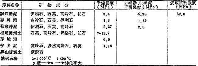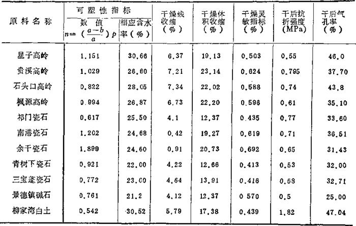 表1-16 原料的成型、干燥性能