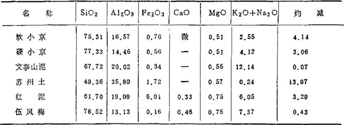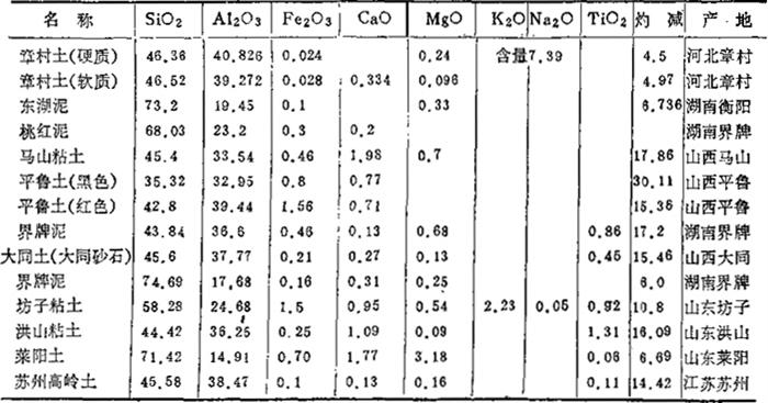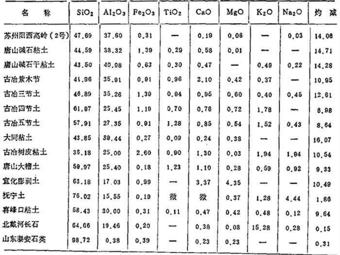 醴陵所产粘土含Al2O3为20-26%,含Fe2O31.0%左右,唯碱性氧化物较多(在3%左右),烧结温度较低;衡阳界牌粘土系原生高岭土,含游离SiO2约25-30%,耐火度在1700℃以上,烧后洁白,中等可塑性。 3.唐山地区:参见表1-20至表1-25。 表1-20 原料的化学成分 (重量%)