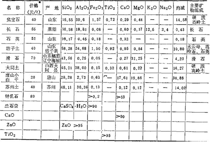 表1-27 原料价格,化学组成、矿物组成 (重量%)