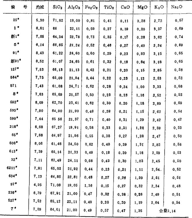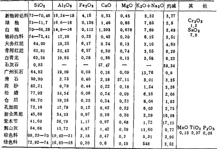 表1-32 石湾某陶瓷厂坯、釉料、原料化学成分 (重量%)