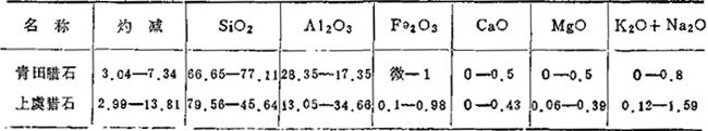 温州某厂部分原料情况: 腊石 按产地不同,分为青田腊石、晶化腊石、寿山石,硬度约为莫氏2-1.5,质地柔滑,小鳞片结构,属伊利石类。 石灰石 产地浙江长兴,含有99%的方解石,系花岗岩变晶结构。 马鞍岭粘土 主要成分有高岭石、多水高岭石、石英,还有水云母、钙长石,再有少量钛铁矿、针铁矿。漂洗(淘洗)前,该粘土灼减量3-7.83%、含Al2O319-20%、Fe2O30,3-0.8%、K2O+Na2O1-1.5%,粘结强度1.44MPa,膨胀系数平均值a=7.70×10-6;漂洗后,Al2O3为24-26%,K2O+Na2O含量基本不变化,a=5.7×10-6。马鞍岭粘土的特点是可塑性好,干坯强度高。 大同砂 主要成分为高岭石,多水高岭石,还有少量长石、白钛石、黄钛矿。含Al2O330-38%,灼减量9-23.41%; 迪开石 属高岭石族矿物类,含Al2O338%,灼减量14%。 青田、上虞腊石的化学成分,见表1-33b。 表1-33b 腊石化学成分范围
