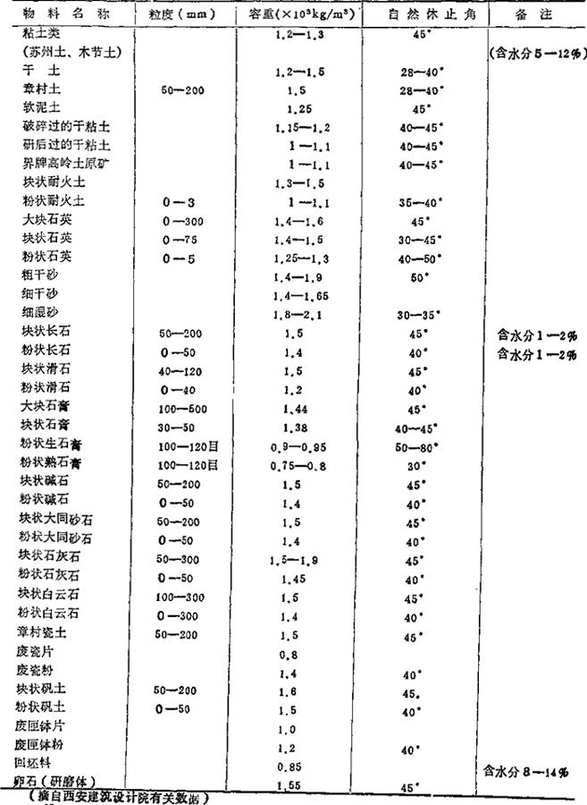 物料容重及其自然休止角,参见表1-35。 表1-35 物料容重及其自然休止角
