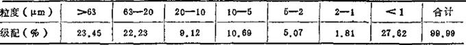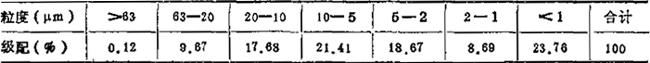 ④粘土原料性能 a.水化程度 水化100号筛余0.075%,膨胀容2.5m2/g,吸附水1.62%(干基),吸水值46.0%(干基)。 b.颗粒分析