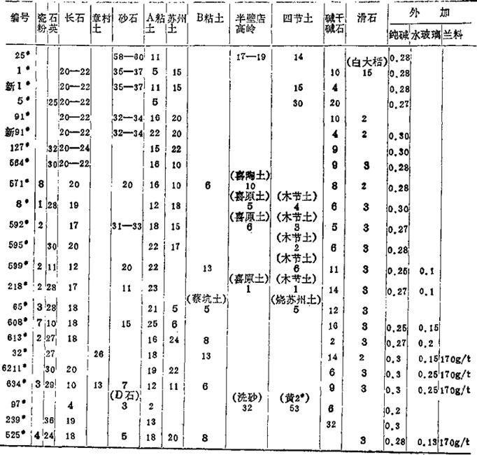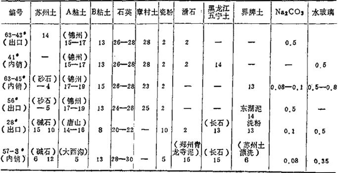 表1-42配方沿革说明: 25#泥 比较柔和好用,但产品色彩灰暗,1951年停用。 1#泥 比25#色泽好,但成型性能不很柔和,1951年因碱干不足及成型不良而停用。 新1#泥 成型性能稍好但仍次于1#,仍不甚柔和,于1952年改用5#。 5#泥 柔和,但有产品炸裂问题,仅使用2个月改为91#。 91#泥 柔和好用,成型工人欢迎,从1952年使用到1955年。 新91#泥 柔和好用,色调不如91#,于1955年改为127#。 127#泥 可塑性差、色调较白,但有炸裂问题,于1956年停用。 564#泥 较白,不太柔和,后因苏州土、碱干供应紧缺于1957年停用(生产暖气泥片)。 571#泥 成型好,不太白,于1958年改为8#。气 8#泥 成型好用,色泽也好,后因碱干、石英紧张,于1959年改为592#。 592#泥 柔和好用,不如8#泥白,后因砂石及苏州土供应不足,使用2个月后改599#。 595#泥 生产暖气片泥料,后因苏州土不足改599#。 599#泥 柔和好用,色调不好,于1959年改用218#。 218#泥 成型好,白度高于599#,但白度仍不高,于1960年5月改为65#。 65#泥 柔和洁白,因石英不足于1960年改为608#。 608#泥 塑性不强,白度不高,于1961年改为613#。 613#泥 塑性好,烧成缺陷多,不洁白,于1962年11月改为6211#。 6211#泥 成型好用且洁白,后因苏州土紧缺,于1963年4月改为634#。 634↑(#泥 柔和好用且洁白,泥浆稳定。 97↑(#泥 是面盆坯体泥(外层还上化妆土239#)。 239#泥 系97#泥坯的化妆土。 525#泥 洁白,成型性能差,只用于制作样品。 表1-43 60年代某生产配方 (重量%)