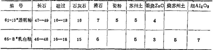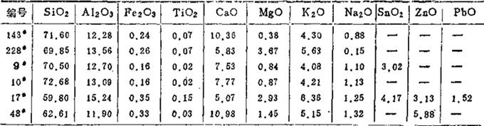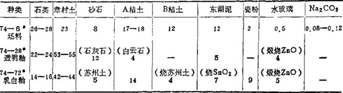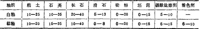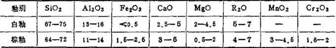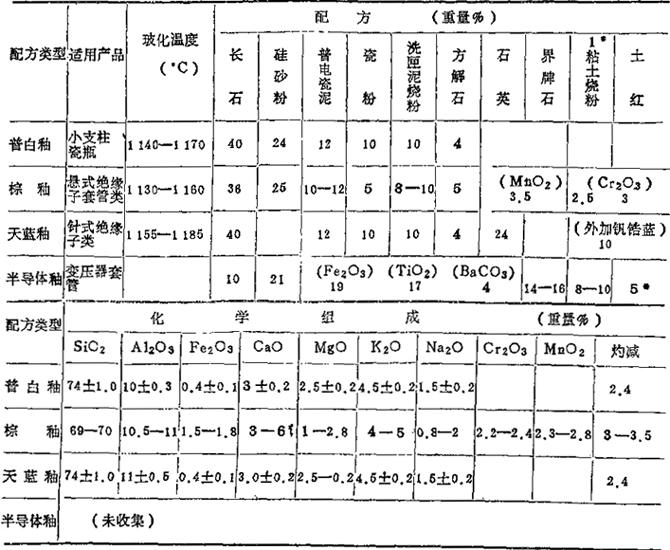表中的碳酸盐熔剂主要为方解石、石灰石、白云石,棕釉的着色剂主要为氧化铬、氧化锰、氧化铁或红土。(摘自:同上表) 表1-74 电瓷白釉、棕釉的化学组成 (重量%)