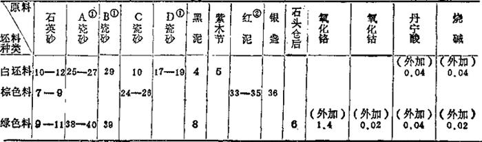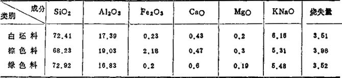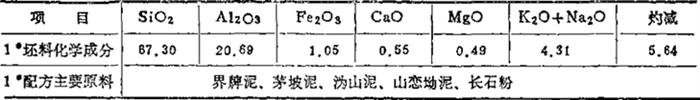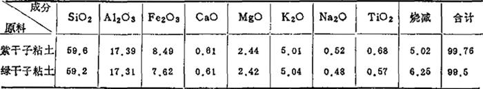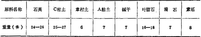 注:①风化长石——高K2O、Na2O的原生高岭土; ②本地红泥——含Fe2O39%, 表1-68 锦砖坯料化学成分 (重量%)