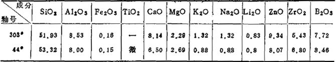 磷渣釉面砖坯体素烧温度较低,坯体膨胀系数低,要求釉的组成与其相适应。表1-66所列303#、44#无铅低温硼锆釉,均能与上述坯体相配合,该两釉料釉式分列于下:303#釉