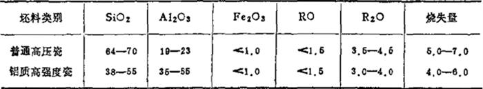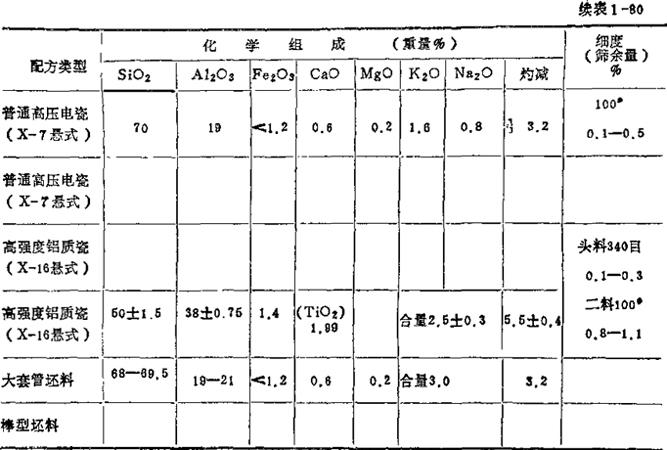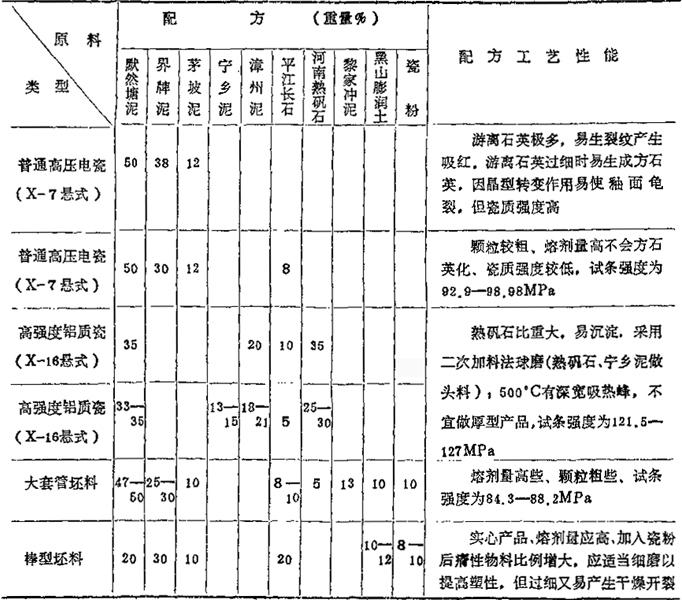 6.某电瓷厂各类高压电瓷坯料配方化学组成范围及工艺参数,参见表180。 表1-80 高压电瓷坯料配方、化学成分、工艺性能