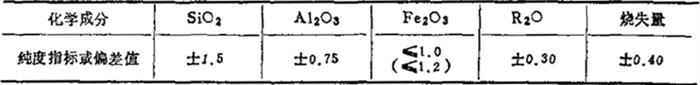 (摘自:机械工业部电器工业局指导性技术文件JB/DQ7079-83) (2)对适用于普通高压电瓷的矿山原料化学成分允许偏差,参见表1-11。表中R2O成分为K2O+Na2O的合量。 表1-11 矿物原料的化学成分偏差