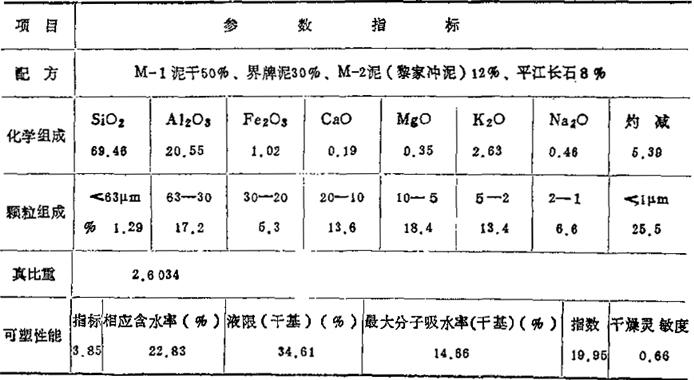 c.真比重 2.6164MPa d.可塑性能 指标2.05,相应水分39.05%(湿基),液限42.55%(干基),最大分子吸水值21.72%(干基),指数20.83。 e.干燥性能 成型水分28.03%,线收缩率4.55%,体收缩率16.98%,气孔率40.70%。 f.结合性能