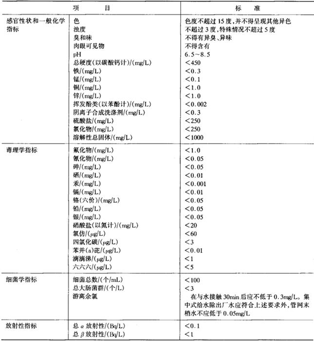 | 释义 | 我国饮用水的水质标准 水是饮料生产必不可少的原料之一,直接饮用的各种饮料,其成分的85%以上是水。另一方面,果蔬原料,生产设备,贮罐与管路系统,瓶、罐等包装容器等的洗涤用水,由于这些用水或多或少会直接或间接地带入饮料中,因此不仅用于配料、化糖等的饮料用水,而且生产过程用水,不论取自何种水源,其水质首先必须符合我国GB5749《生活饮用水卫生标准》的规定(见表1-1-1),其次饮料用水还应符合表1-1-2的软饮料用水标准。 表1-1-1 生活饮用水卫生标准(GB 5749)