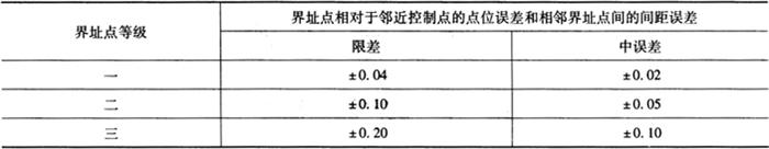 房产界址点(以下简称界址点)的精度分三级,各级界址点相对于邻近控制点的点位误差和间距超过50m的相邻界址点的间距误差不超过表17-1的规定;间距未超过50m的界址点间的间距误差限差不应超过下式计算结果。