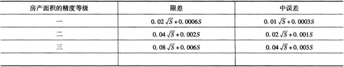房产面积的精度分为三级,各级面积的限差和中误差不超过表17-2计算的结果。