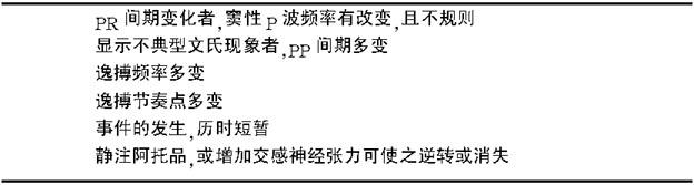 | 释义 | 房室传导阻滞 房室传导阻滞(atrioventricular block,AVB)系激动自心房经房室交界区希氏束向心室传导过程中,激动被延迟,部分或全部阻断。 【病 因】 常见病因有急、慢性心肌缺血,高血压病,心肌病,心肌炎,房室交界区退行性变,心肌浸润性疾病,电解质紊乱以及应用各种具有心肌抑制作用的药物等,当上述病因作用于房室传导组织,使之缺血、缺氧或变性、纤维化、不应期延长,遂引起房室传导阻滞。 【诊 断】 (一) 临床表现 Ⅰ度房室传导阻滞者,临床表现多无症状,心脏听诊第一心音略减弱;Ⅱ度房室传导阻滞者,心脏停顿或心悸感,听诊心音脱漏,脉搏也相应脱漏。室率过于缓慢者,头昏、乏力、活动后气促,甚至短暂晕厥;Ⅲ度房室传导阻滞者临床常有心脑供血不足的表现。听诊心率慢而不规则,35~50bpm,第一心音强(大炮音)弱不等,收缩压增高,脉压增宽。心室停搏超过15s,出现晕厥、抽搐、发绀等阿斯综合征表现。 (二) 心电图特点 1.Ⅰ度房室传导阻滞 PR间期≥0.20s,P波后均有QRS波群相随。研究发现,PR间期系由房间传导(10~50ms)、房室结传导(90~150ms)以及希氏束内和希普传导(25~55ms)等成分构成。心电图描记得形态及时限正常QRS波群的Ⅰ度房室传导阻滞者,经房室结内传导的时间超逾85%;而激动传经希氏束的时间不及15%;然而,遇QRS波群增宽的Ⅰ度房室传导阻滞者,则传经房室结的时间<25%,而激动经房室结以下部位传导的时间增至45%。 2.Ⅱ度房室传导阻滞Ⅰ型(文氏型) PR间期逐渐延长,RR间期逐渐缩短,直至P波不能下传,QRS波群脱落,最长的RR间期小于最短RR间期的2倍。 3.Ⅱ度房室传导阻滞Ⅱ型(莫氏型) PR间期固定,QRS波群间歇性脱漏。 临床遇Ⅱ度房室传导阻滞,当其房室传导比例为2∶1者,甚难区分是Ⅰ型,抑或为Ⅱ型。有认为,凡P波可以下传,且相随之QRS波群较窄,形态正常,而其PR间期有延长者,以Ⅱ度Ⅰ型房室传导阻滞为可能;而遇P波下传,但下传之QRS波群呈束支阻滞型,所测PR间期正常者,则以Ⅱ度Ⅱ型房室传导阻滞可能为大。 4.Ⅲ度房室传导阻滞 心房由窦房结控制,或是房颤、房扑;心室由阻滞以下低位起搏点控制、房室分离;心房率明显快于心室率。如低位起搏点位于希氏束以上,则室率在40~60bpm,QRS波相对正常;如低位起搏点位于希氏束以下,则室率在20~40bpm,QRS波畸形。 【鉴别诊断】 迷走神经紧张性阻滞(vagotonic block) 迷走神经张力增高可见于某些特定情况,诸如熟睡、恶心、呕吐、深吸气、鼻或胃插管、排尿、咳嗽、吞咽、中枢神经系统损伤伴颅内高压以及等张运动等。患者窦性频率较缓慢,心电图描记为PR间期延长,或P波不能下传,酷似Ⅱ度Ⅰ型,或Ⅱ型房室传导阻滞。 通常,迷走神经介导的心动过缓,历时短暂,多无眩晕、黑矇或明显晕厥症状,故无需治疗。若需予治疗者,可静脉输注阿托品,以加速房室间的传导。临床尤应注意的是,尽管阿托品可递增心房频率,但却又能使心室率矛盾地减慢,系频速心房激动加剧房室传导系统不应期所致。 表2-14-1.诊断迷走神经介导房室传导阻滞的临床线索