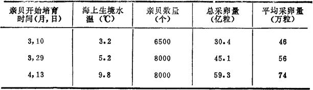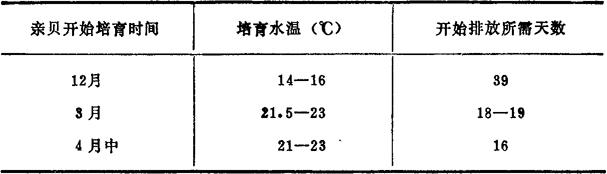 2.培育 一般将亲贝装于多层网笼中,每笼100个或80个,均匀吊挂培育池中。亦可在培育池上部装置网箱培育亲贝;或在培育池上部水层横置大网片将亲贝均匀地撒在网片上培育。培育期间按时检出死亡个体及错壳个体(韧带松弛造成)。 (1)水温:在胶州湾海区,海湾扇贝的生殖期为5月中至7月中(6月上旬为盛期)及8月下至10月;栉孔扇贝的生殖期为5月中、下旬至7月及9月下旬至10月中旬。为了提前育苗,通常在早春3-4月份便将亲贝取入培育池内,逐步升温促进性腺成熟。在给饵条件下,如表15-2所示,在适温范围内(15-30℃),培育水温越高,达到性成熟的时间越短。 表15-2 海湾扇贝性腺成熟排放与培育水温及取贝时间的关系