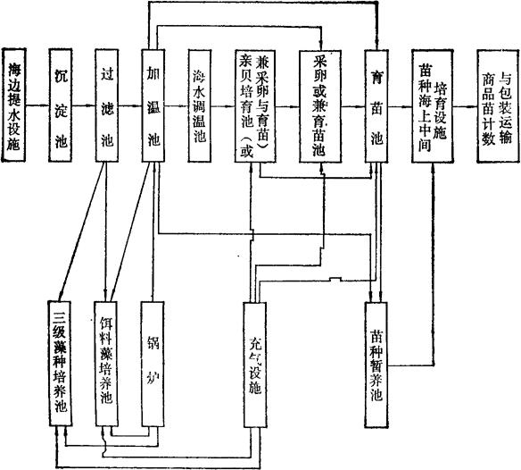 其中V2和C2为已知,C1经血球计数板计数(或以比色法得出),据此求出V1。 8.幼体检查 在育苗过程中应密切注意幼体的生活状态。每天早上应按时取样测定幼体数量及生长数据,以判断培养条件是否适宜。同时,根据幼体胃含物的饱满程度和内脏团颜色调整投饵量。在正常情况下,有相当数量的幼体浮游在培育水体上层,因此,育苗池上层幼体数量的变化是显示问题较敏感的标志。 (四)采苗 海湾扇贝的幼体在22-23℃培育条件下,受精后10天便开始出现眼点,眼点幼体的壳长为150-220μm,幼体群体出现眼点幼体时的平均壳长为170-190μm。栉孔扇贝幼体在16-21℃培育条件下,受精后16天出现眼点,在21-25℃时,12天出现眼点,幼体群体出现眼点时的平均壳长分别为150μm及170μm。华贵栉孔扇贝的幼体在26-27℃时受精后12天开始出现眼点。 扇贝育苗池内当出现眼点幼体时便进行清池,继而投放采苗器采苗。在清池过程中如发现幼体密度过大则进行分池,过小则进行合池。 海湾扇贝幼体附着的适温为19-28℃,最适温为25℃,温度低于16℃或高于32℃时幼体不变态(栉孔扇贝幼体高于25℃时不变态);变态附着的盐度为18-33‰,最适盐度为22-26‰,高于35‰或低于11‰时不附着。 细棕绳苗帘(绳径约3mm,重3g/m左右)与聚乙烯网片〔(5-8)丝×3〕都是采苗效果较好的器材。每米3培育水体投放棕帘3-4kg(棕绳长共1000-1300m),或聚乙烯网片2-2.5kg(13-15片,每片4000-4500网目,网目长2-3cm)。棕绳在编制苗帘前应以70-80℃淡水反复浸泡,至浸水无色为止,或以0.5-1‰浓度的火碱浸泡1天,然后捶打并浸泡,彻底清除杂质碎屑及可溶性有害物质。 采苗器入池前以10-20ppm青霉素处理后使用。育苗池内投放采苗器要考虑布局均匀,上层水体及池四角处适当多投为宜。棕帘采苗器最好采用浮动式安放,即将棕帘挂在浮于池水面的支撑物上;聚乙烯网片则将其一端以坠石固定于池底,另一端游离于水体中。两种安置方式都会使采苗器在换水时不致露出水面。投放采苗器后应适当提高换水量及延长充气时间。幼体大部附着后可适当加强光照强度提高幼苗对光的适应能力。幼苗出池前逐步降低培育水温使其接近海区的自然温度。 (五)幼苗中间培育 扇贝幼苗在培育池中,平均壳高达350-700μm时,便移到海上或养虾池中继续养育,直到培育成商品苗(平均壳高5mm),这一作业称之为“中间培育”。自采卵至幼苗出池历时20-30天。出池后在海上培育约两个月便长成商品苗。春季虾池水温回升较海上快(相差4-7℃),因此在虾池内中间培育扇贝苗,能较海上提早约1个月提供商品苗。 海上中间培育的关键在于提高保苗率。塑料筒盛苗与网袋盛苗相结合的中间培育工艺比单纯以网袋中间培育能提高保苗率一倍以上。其方法是:将出池苗帘(或网片)装进并固定于塑料筒中,两端以0.5mm孔目的聚乙烯筛网封闭,挂在浮筏上垂于水面下约2m处养育,7-10天后,将筒口筛网更换为0.8mm孔目筛网。再经1-2星期后,将苗帘(或网片)从筒内取出,移至0.8mm孔目的大网袋中(80×50cm)。幼苗长至平均壳高2-3mm时便开始从采苗器上脱落,这时便将采苗器上的苗及脱落在大网袋中的苗刷洗下来,洗净并清除敌害动物(如小海星等),再按一定数量(一般为1000个)分装于苗袋(小网袋,30×25cm)中,苗袋封口,栓于吊绳上。一吊为10袋或20袋,挂在浮筏上一直养至商品苗规格出售。 出池苗养至商品苗的保苗率一般为10-20%,在虾池内中间培育的保苗率可达到50%以上。幼苗从大网袋分至苗袋后的保苗率一般为60-90%。 扇贝工厂化育苗工艺流程: