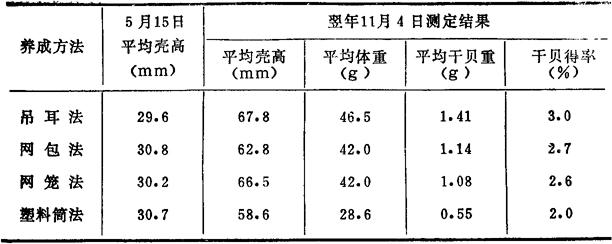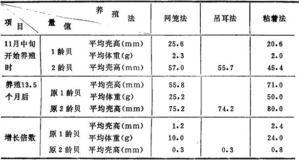 (5)网袋养殖法:该法是将网目为2-3cm的网衣缝成若干网袋,附于主聚乙烯网衣上,扇贝装于袋内养成,袋口系有线绳。此法取放扇贝容易,生长和成活率均高,风浪大的地方也可养殖,但成本略高。 (6)粘着养殖法:该法是将小块纱布浸透环氧树脂等粘着剂,贴在附苗板上,然后将2cm以上的扇贝苗右壳粘附在纱布上,阴干约1h,即吊挂浮架上养殖。该法养殖的扇贝生长快(表15-5),壳高增长为笼养法及吊耳法的2倍多,体重增长也为笼养法的2倍多,但该法养殖扇贝脱落严重(近乎一半),成本较高。 表15-5 粘着法养殖栉孔扇贝生长与其他法比较