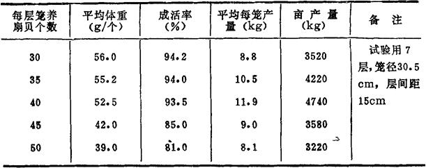 筏式养殖用的单绳筏除漂浮于水面外,也可将部分浮子以一定长度的绳索与单绳筏连系起来,令单绳筏沉于一定水层中,称为深水筏。深水筏养殖扇贝的优点是养殖水层较深(可至20m),附着生物少,水温较稳定,风浪危害较小。 为了取得更大效益,单项的扇贝筏式养殖作业已发展为与海带(或石花莱)间养或套养。在水深、流畅的海区,扇贝与海带各以10-15亩的养殖区相互间隔排列;在水浅流小海区则进行套养,即在同一筏上每隔1-2绳海带挂养1笼扇贝,或每隔1筏海带套养1筏扇贝,或在扇贝养殖区平养海带。 海湾扇贝养成周期较短(约6个月),适合与海带轮养。即在同一海区利用同一套筏架,11-12月至翌年6月低温期养殖海带,7月至11-12月高温期养殖海湾扇贝,1年双收,提高生产效益。 根据扇贝、牡蛎生长水层不同的特点(牡蛎栖水层较扇贝浅),利用浮筏进行虾夷扇贝与牡蛎混养,该法可充分利用水域空间,节省材料。 2.地播养殖 筏式养殖扇贝属成本高、投资大的产业。为了减少投资,选择适宜海区,直接撒播幼扇贝于海底(底播放流)进行粗放养殖称为地播养殖。这项工作实际上是补充自然海区扇贝的资源量,长成后进行回捕,促进自然繁殖,具有增殖意义,因此通常又称为地播增养殖。 地播放流的海区应当与筏式养殖的海区分开以避免饵料竞争及生物沉积的不良影响。地播扇贝一般选择流速为0.3-0.5m/s的场所,海底以岩礁或含泥的砂砾质硬底为好(含泥量约30%),底面及底面固形物上无浮泥是选择扇贝放流场所的重要标志。地播海区,海星、红螺等敌害生物宜少,而布氏蚶(Arca boucardi)及偏顶蛤(Modiolus modiolus)的出现可作为地播适宜海区的生物指标。地播扇贝的水深一般为6-30m,水浅处(如开阔海区5m以下处)常会遭受拍岸浪冲击影响扇贝安全,同时要注意远离河口区。 日本陆奥湾是有名的地播养殖虾夷扇贝的场所,年播稚贝数十亿个。11月到翌年5月将壳高3-5cm的稚贝按6个/m2以下的密度均匀撒播在海底,养殖2.5年后约有50-70%的个体可长到商品规格(170-200g)。70年代末至80年代初山东桑沟湾地播栉孔扇贝的试验结果表明,壳高2.3-3.6cm的稚贝撒播海底后,有80%以上的个体移动范围不超过60m,17个月长到商品规格(壳高6.6—6.8cm),回捕率达30—50%,平均亩产达300kg以上。 近年山东沿海各地已将地播养殖海湾扇贝转向对虾养殖池。7—8月将壳高1cm以上的海湾扇贝稚贝播撒到硬质底的虾池中(与对虾混养),养至11—12月便达到商品规格。虾池养殖的扇贝,体型较膨凸,软体部肥大,肉柱得率明显高。 地播养殖扇贝的优点是设备简单,节省劳力,投资少,成本低,有利于增殖。目前日本地播养殖产量已在扇贝生产中居主导地位。 五、收成 4月采卵培育的海湾扇贝苗,5月中旬移到胶州湾进行中间培育,6月疏苗,8月分苗到养成笼中,当年底就可收获。平均壳高达5cm以上,平均体重达29—37g,成活率为92—98%,亩产一般达3000—3500kg。继续养至第二年时增长率明显减小,壳高年增长率为3%(大个体)及12%(小个体),体重年增长率为59%(大个体)及65%(小个体),死亡率为62%(大个体)及31%(小个体)。养至第三年时则看不出生长,死亡率达80—99%。肉柱得率随年龄增加而减小。发现有存活35个月的个体。 山东长岛海区自然采苗的栉孔扇贝,11—12月从采苗袋中拣出移到苗笼中进行中间培育,笼每层放250—300个为宜,翌年4—5月壳高达2.5cm以上时,分苗至养成笼中。人工培育的栉孔扇贝苗,如果在中间培育过程中及时疏苗,当年底分苗到养成笼中。在南长山海区水深12—18m,流速0.5—0.6m/s,在每层网笼中养殖35—40个扇贝的情况下,养殖13—14个月亩产可达3500—4000kg。在水浅流速小的海区,即使养20个月,亩产仅有3000kg左右。 栉孔扇贝的养成密度以每层笼35—40个为宜,这种密度能取得较高的产量,较高的成活和较大的个体(表15—6)。扇贝的商品价格与其个体大小成正比,评估经济效益时除产量外还要计及个体大小。因此养成密度在35—40范围内,应根据经济效果进行选择。 表15—6 栉孔扇贝养殖密度与产量的关系
