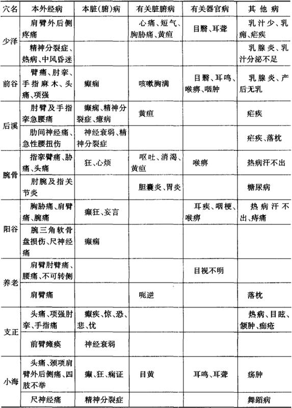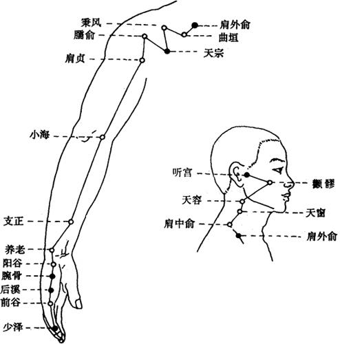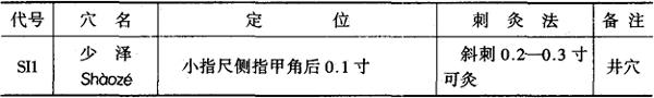 图3-8 小肠经经穴图 1.穴名、定位和刺灸法 见表3-24。 表3-24