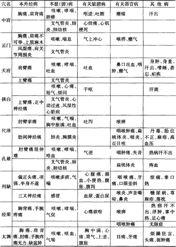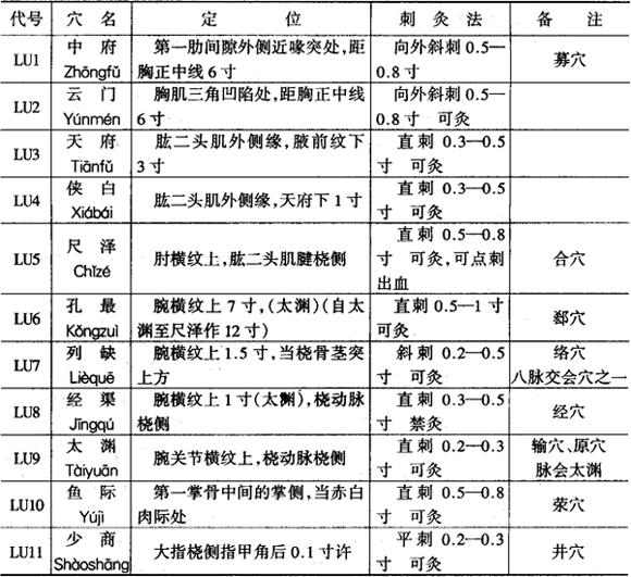 图3-3 肺经经穴图 1.穴名、定位和刺灸法 见表3-14。 表3-14