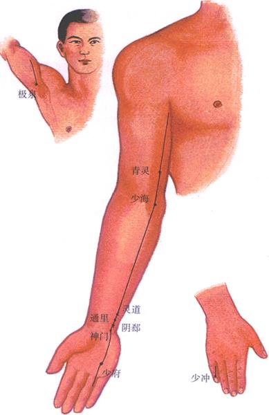 极泉Jíquán(HT 1) 【定位】 在腋窝顶点,腋动脉搏动处。 【主治】 心痛,心悸,肩臂疼痛,胸闷气短,胁肋疼痛,瘰疬。 【操作】 避开腋动脉,直刺或斜刺0.5~0.8寸。 青灵Qīngíng(HT 2) 【定位】 在臂内侧,当极泉与少海的连线上,肘横纹上3寸处,肱二头肌内侧沟中。 【主治】 头痛,胁痛,肩臂疼痛,目视不明。 【操作】 直刺0.5~1寸。 少海Shàohǎi(HT 3) 【定位】 屈肘,在肘横纹内侧端与肱骨内上髁连线的中点处。 【主治】 心痛,癔病,肘臂挛痛,臂麻手颤,腋胁痛,瘰疬。 【操作】 直刺0.5~1寸。 灵道Língdào(HT 4) 【定位】 在前臂掌侧,当尺侧腕屈肌腱的桡侧缘,腕横纹上1.5寸处。 【主治】 心痛,心悸,暴喑,肘臂挛痛,手指麻木。 【操作】 直刺0.3~0.5寸。不宜深刺,以免伤及血管和神经。留针时,不可作屈腕动作。 通里Tōnglǐ(HT 5) 【定位】 在前臂掌侧,当尺侧腕屈肌腱的桡侧缘,腕横纹上1寸处。 【主治】 心悸,怔忡,舌强不语,暴喑,腕臂痛。 【操作】 直刺0.3~0.5寸。不宜深刺,以免伤及血管和神经。 阴郄Yīnxì(HT 6) 【定位】 在前臂掌侧,当尺侧腕屈肌腱的桡侧缘,腕横纹上0.5寸处。 【主治】 心痛,惊悸,骨蒸盗汗,吐血,衄血,暴喑。 【操作】 直刺0.3~0.5寸。不宜深刺,以免伤及血管和神经。 神门Shénmén(HT 7) 【定位】 在腕部,腕掌侧横纹尺侧端,尺侧腕屈肌腱的桡侧凹陷处。 【主治】 心痛,心烦,惊悸,怔仲,健忘,失眠,痴呆,癫狂癎等心与神志病变,胸胁痛。 【操作】 直刺0.3~0.5寸。 少府Shàofǔ(HT 8) 【定位】 在手掌面,第4、5掌骨之间,握拳时,当小指尖处。 【主治】 心悸,胸痛,阴痒,阴痛,痈疡,小指挛痛,小便不利,遗尿。 【操作】 直刺0.3~0.5寸。 少冲Shàochōng(HT 9) 【定位】 在小指末节桡侧,距指甲角0.1寸。 【主治】 心悸,心痛,癫狂,热病,昏迷,胸胁痛。 【操作】 浅刺0.1寸,或点刺出血。 |