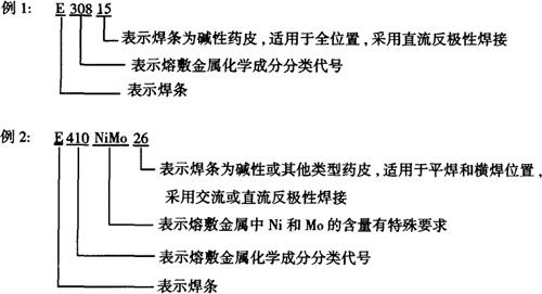 GB/T983-1995中规定的不锈钢焊条型号编制方法如下:字母“E”表示焊条;“E”后面的数字表示熔敷金属化学成分分类代号,如有特殊要求的化学成分,该化学成分用元素符号表示,并放在数字的后面;短划“-”后面的两位数字表示焊条药皮类型、焊接位置及焊接电流种类。