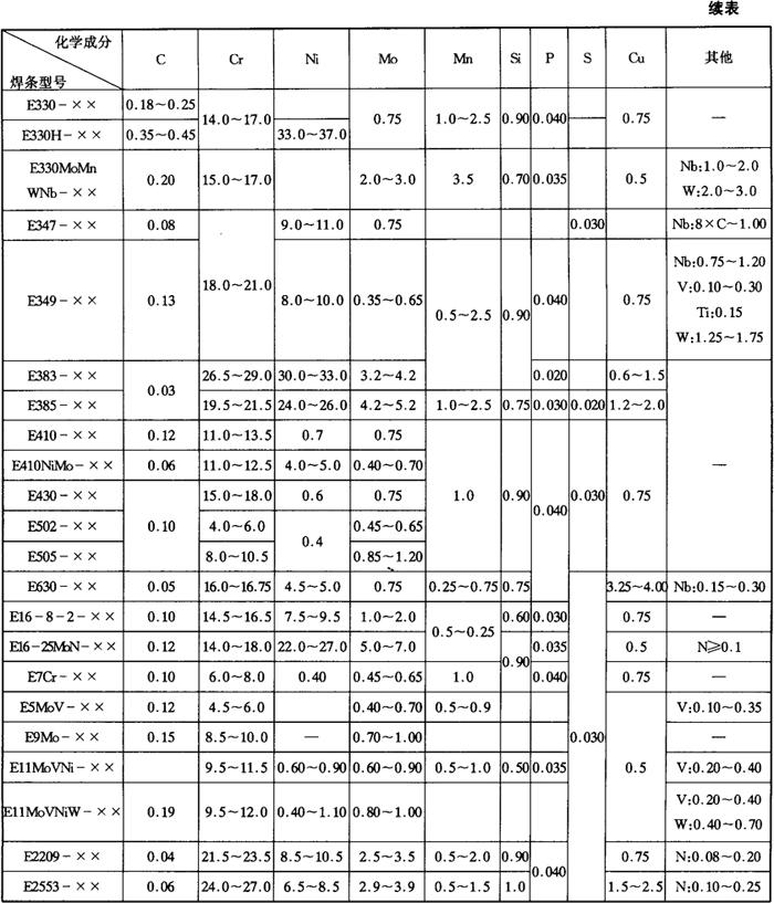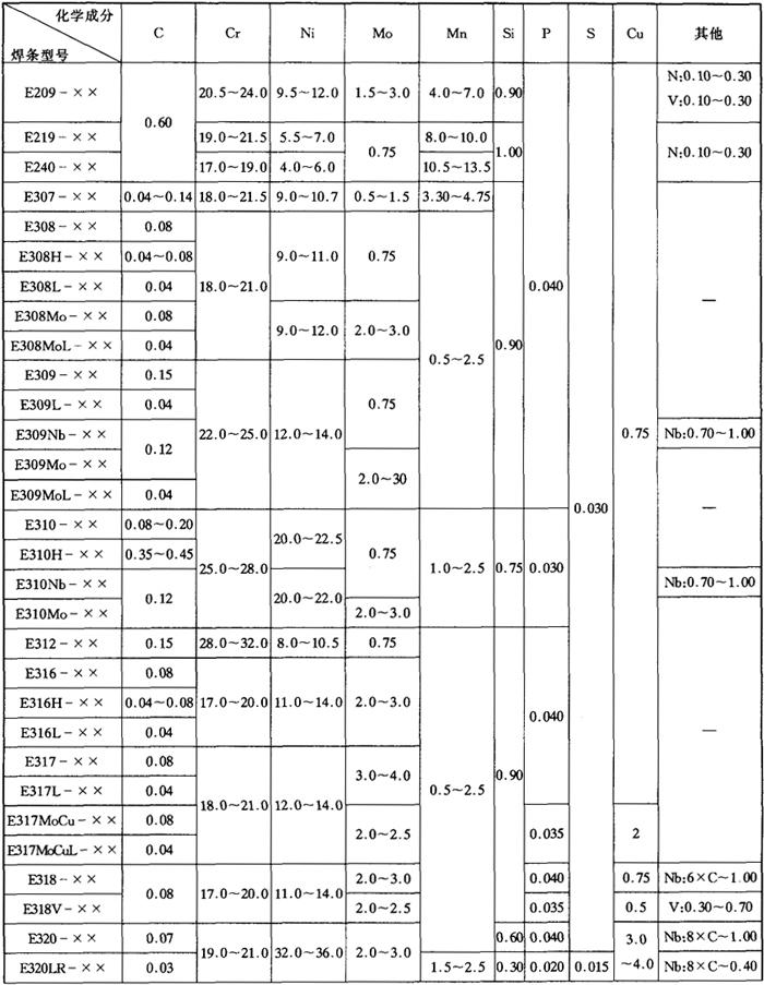 GB/T983-1995根据熔敷金属的化学成分、药皮类型、焊接位置及焊接电流种类划分的不锈钢焊条型号见表5-3、表5-4。 表5-3 各型号不锈钢焊条焊缝金属化学成分(%)