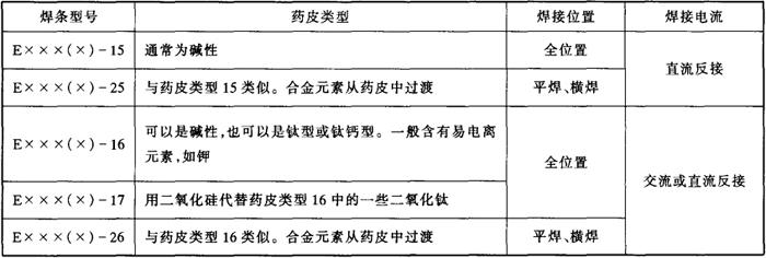 注:①表中单值均为最大值。 ②当对表中给出的元素进行化学分析还存在其他元素时,这些元素的总量不得超过0.5%(铁除外)。 ③焊条型号中的字母L表示碳含量较低,H表示碳含量较高,R表示碳、磷、硅含量较低。 ④E502、E505、E7Cr、E5Mo、E9Mo型焊条将放入下次修订的GB5118《低合金钢焊条》标准中,而从本标准中删除。 ⑤后缀-××表示-15、-16、-17、-25或-26。 表5-4 各型号不锈钢焊条药皮类型、焊接位置及焊接电流