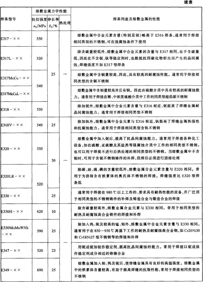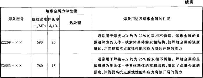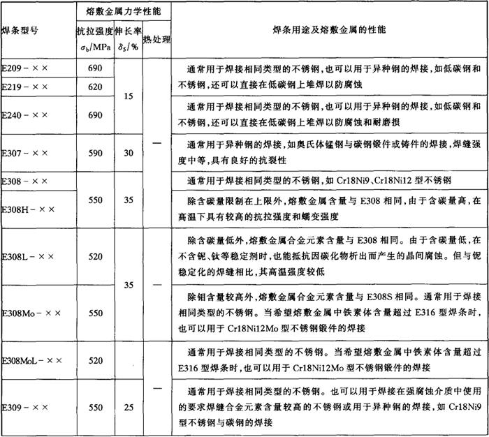 注:直径≥5.0mm的焊条不推荐全位置焊接。 各型号不锈钢焊条的力学性能和主要用途见表5-5。 表5-5 各型号不锈钢焊条的熔敷金属力学性能和主要用途