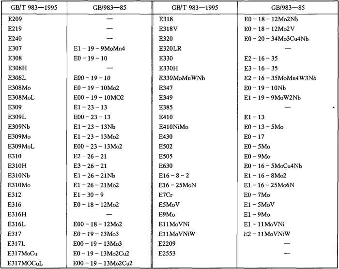 国家标准GB/T983-1995中与旧国家标准GB/T983-85中的型号表示方法不同,其对照表见表5-6。 表5-6 新旧国家标准中不锈钢焊条型号对照表