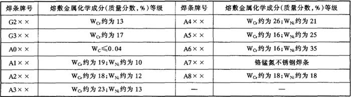 表5-1 各牌号不锈钢焊条焊缝金属化学成分等级