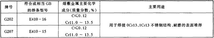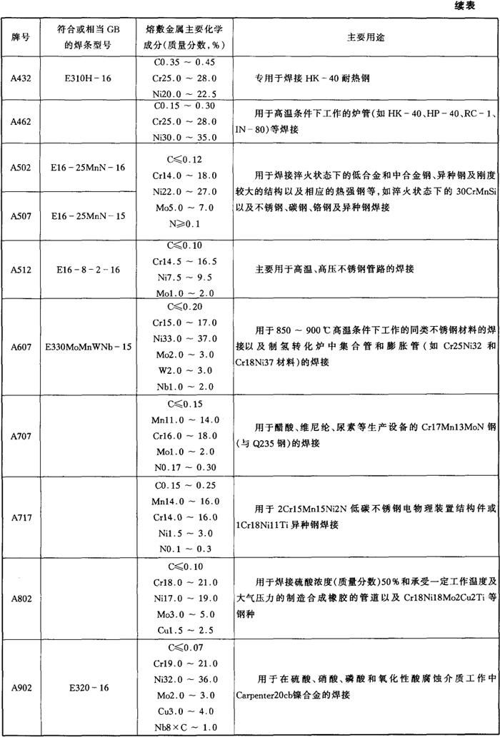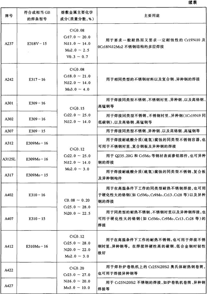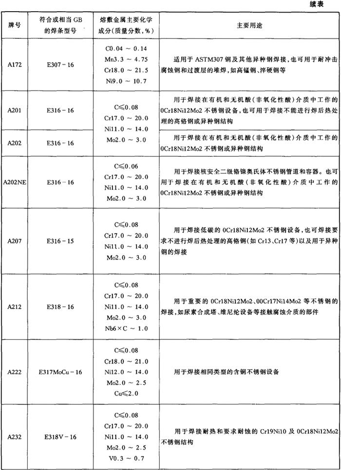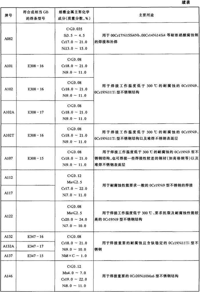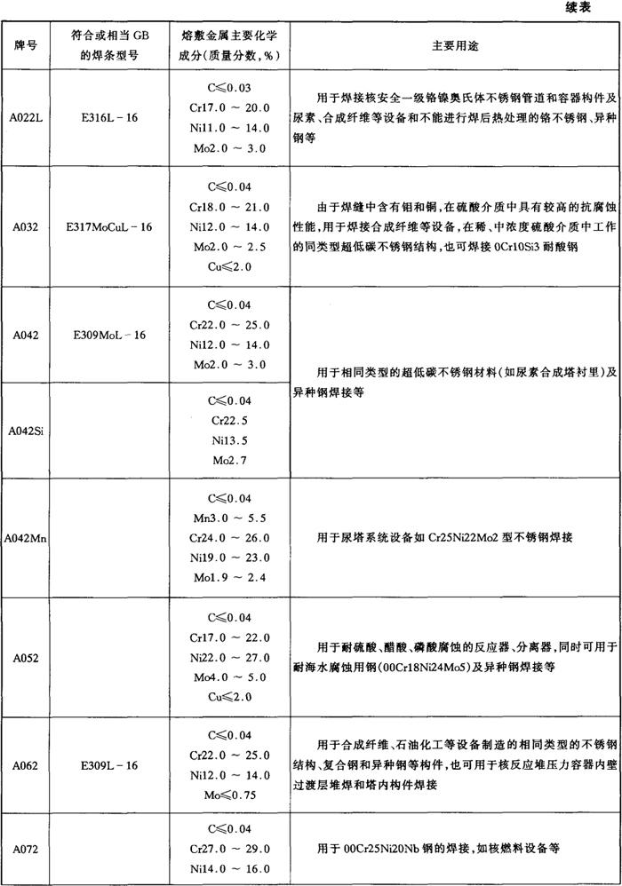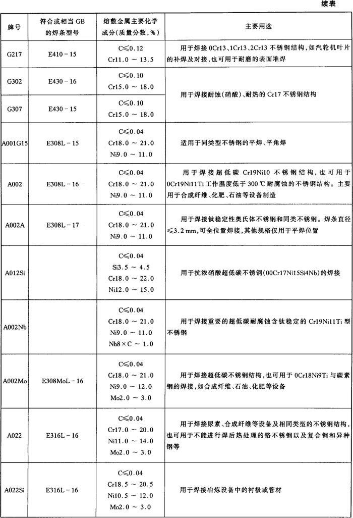 表5-2 各牌号不锈钢焊条熔敷金属主要化学成分及主要用途