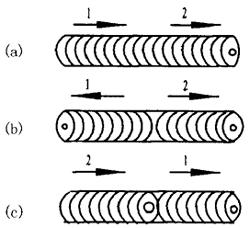图1-2-7 常用焊条运条方式[15] (a)锯齿形 (b)月牙形 (c)环形 (d)8字形 (e)斜锯齿形 (f)三角形 5.焊缝连接方法 手弧焊时,由于受到焊条长度的限制,经常要用几根焊条才能完成一条焊缝,因而出现了焊缝前后两段连接的问题,而且焊缝连接处如操作不当,极易造成气孔、夹渣以及外形不良等缺陷,因此,在焊缝连接过程中应尽量不要拉断电弧。在实际生产中,图1-2-8示出了常用的焊缝连接形式。 当焊缝采用如图1-2-8(a)所示的顺序进行焊接时,在前段焊缝收尾时,应减小焊条与工件夹角,把弧坑里的熔渣向后赶,或者用另一根焊条的夹持端将弧坑里尚未凝固的熔渣迅速扒去,形成一个弧坑。随后立即在弧坑前引弧,并略微拉长电弧,预热连接处,然后引回弧坑,等填满弧坑后再向前焊接。换焊条的动作要快,不要使弧坑过分冷却,因为热态连接,可以使连接处外形美观。 采用图1-2-8(b)所示反向焊接时,要求在焊前段焊缝时,起焊处焊条要移动快些,使焊缝的起焊处略低一些。而在焊后段焊缝时,应在前段焊缝起焊处前面引弧,再拉至前段起焊处进行焊接。 采用图1-2-8(c)所示分段退焊时,同样要求前段焊缝起焊处略低些,使连接处焊缝高低、宽窄均匀。