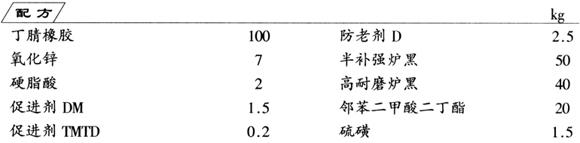 先将丁腈橡胶和邻苯二甲酸二丁酯混合,采用低温、小辊距、分批加料法进行塑炼,均匀后再加入其余全部组分共同混炼,薄通,得到胶料。按皮碗加工工艺成型,经硫化,制成打气筒用橡胶皮碗。