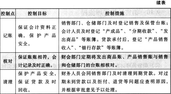 为了实现上述控制目标,应该在产品销售系统中相应地设置下列控制点和关键控制点:咨信、签约、审签、核发、验证、托收、记账、核对、清理。其中,托收、记账和核发为关键控制点。