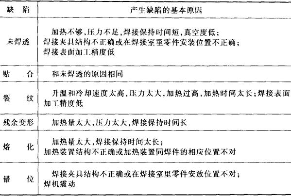| 释义 | 扩散焊接头的质量检验 扩散焊接头的主要缺陷为未焊透、裂纹、变形等,产生的影响因素也较多。表7-60列出常见缺陷及主要原因。 表7-60 扩散焊常见缺陷