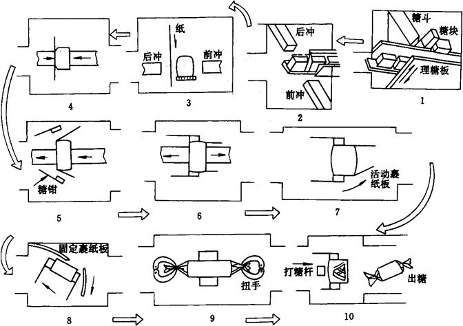 | 释义 | 扭结式裹包机 1 应用范围 扭结式裹包机分为单扭结和双扭结两种,主要适用于糖果、冰棒、食品、药丸(圆柱形、长方形)等物品的自动裹包。也适用于日用品、小五金等行业中各种类形物的自动裹包。根据需要可利用单张、双层或多层纸包装。 2 基本原理和主要结构 扭结式裹包机一般需要完成被包装物的整理排列、输送、包装纸的切断供给、夹紧裹包、扭结、排出等动作。下面介绍双扭结式裹包机的基本原理和主要结构。 双扭结式裹包机包糖工艺流程如图2-4-9所示。