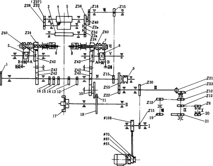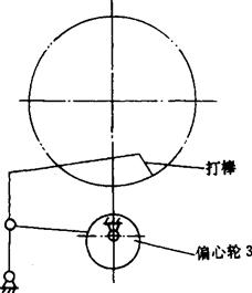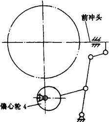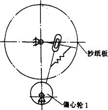 图2-4-10 BZT150I型机传动系统示意图 1-手轮 2-扭手凸轮 3-滚刀轴 4-滚筒 5-卷纸轴 6-扭手凸轮 7-扭手套轴 8-扭手 9-离合器 10-齿拨盘 11-滚轮 12、13、14、15、16-偏心轮 17-糖钳转盘 18-马氏盘 19-糖刷 20-带轮 21-理糖 2.1.1 理糖传动 轴Ⅰ经过链轮、轴Ⅲ、伞齿轮、轴Ⅸ带动理糖插板上、下移动,使糖块在输送轨道内以一定形式通过;经轴Ⅸ、链轮、轴Ⅷ带动糖刷转动清除输糖轨道内的重叠糖块;经轴Ⅸ、链轮、轴X带动Φ92输送带轮转动,使输送带以一定的速度在输糖导轨内输送糖块。 2.1.2 主传动 轴Ⅲ经齿轮、离合器带动轴Ⅳ、轴Ⅱ、轴V、轴Ⅵ和偏心轮1、2、3、4、5转动。离合器闭合时,轴Ⅳ转动,主系统停止转动。由于采用以上装置,使理糖系统始终能保证糖块的正常供给。主传动包括抄纸、糖钳张闭、打糖、前冲送糖、后冲接糖、扭结、送纸、切纸、钳盘间歇运动等动作。现分述如下: (1)抄纸 轴Ⅳ上偏心轮12通过杠杆系统使抄纸板上、下移动,完成抄纸动作; (2)糖钳张闭 轴Ⅳ上偏心轮13通过杠杆系统使糖钳凸轮来回摆动,通过滚子、杠杆使糖钳张开或紧闭; (3)打糖 轴Ⅳ上偏心轮14通过杠杆系统使打棒来回摆动,将裹包好的糖块沿输送糖导轨打出; (4)前冲送糖 轴Ⅳ上偏心轮15通过杠杆系统,使前冲头在导轨上作往复运动,完成送糖动作; (5)后冲接糖 轴Ⅳ上偏心轮16通过杠杆系统使后冲头在导轨上作往复运动,完成接糖动作。该机构设有缓冲装置,以保证安全有效地接糖; (6)扭结 轴Ⅳ、齿轮带动轴V转动,轴V、齿轮带动扭手套轴转动。扭手凸轮经杠杆系统A,使扭手套轴作轴向移动,带动扭手进退。扭手凸轮经杠杆系统B和扭手中扇形齿轮、齿条使扭手张开或闭合; (7)送纸、切纸 轴Ⅳ、链轮、轴Ⅶ、齿轮带动卷纸轴动,卷纸轮经齿轮带动橡皮滚筒转动,完成送纸动作;卷纸轴经齿轮带动滚刀轴转动将纸切断; (8)钳盘间歇转动 轴Ⅳ经齿轮、拨盘、滚轮、马氏盘使钳盘作间歇转动。 该机采用离合器齿轮副W把理糖传动和主传动有机连接,若主传动或排糖等出现故障,一般可不停车,而操纵离合器使主传动和理糖传动有效分离,操作极为方便。 2.2 主要结构 双扭结式糖果包装机的主要结构: 2.2.1 送纸机构 送纸机构位于切纸刀架上方,由固定在主柱上的支承轴、套筒、夹纸盘等组成。轴端装有油环,铜衬与套筒紧配,并能在轴上转动;两片夹纸盘用支点螺钉固定在套筒上,当卷筒纸被进纸滚筒牵引时套筒与纸卷同转进给。本机构设有调节滑轮和调节螺杆,借以调节卷筒纸位置。该机配有两个卷筒纸架。 2.2.2 切纸刀架 切纸刀架位于进纸滚筒(橡皮滚筒)下方,切纸动作由一固定在刀架上的固定刀片和滚动刀片来完成。由滚刀轴转动,使滚动刀与固定刀摩擦把纸裁下。 2.2.3 裹包执行机构 糖块裹包执行全过程是由前冲头送糖、后冲头接糖、抄纸板抄纸、挡板裹包折叠、扭结手扭结封闭和打棒杆打糖等动作配合完成。前冲、后冲、抄纸、糖钳、打糖机构示意图如图2-4-11至图2-4-15所示。这些动作是通过偏心轮及连杆机构来实现。这些动作的互相配合协调,可根据上述的包装顺序,通过各偏心轮在主轴Ⅳ的位置调整来实现。