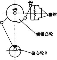 图2-4-15 打糖 2.2.4 扭结机构 糖块经包装纸裹包后,双端需扭结封闭,扭结机构由左右对称二部分组成。扭手须完成以下三个动作: (1)扭手张闭,把纸夹紧或放开; (2)扭手旋转,把包装纸进行扭结; (3)扭手作轴向往复运动,因为包装纸扭结后长度要缩短,因此扭手在扭结旋转时还须向糖接近,以避免把纸扭断。 机器工作时,传动系统带动轴V转动,轴V上齿轮通过扭手齿轮及扭手套轴带动扭手旋转把包装纸扭折成结(扭折角度一般为360°左右)。 扭手凸轮驱动杠杆系统A左右摆动,并通过拨轮使扭手套轴作轴向移动,带动扭手进退。 扭手凸轮通过杠杆系统B及拨轮使扭手轴在扭手套轴内来回移动,扭手轴通过端部的扇形齿轮、齿条使扭手张开或闭合,完成对包装纸的夹紧或放开动作; 弹簧使两个摆杆与凸轮接触,并使扭手以弹性力夹紧。 2.2.5 钳盘(即工序盘)机构(图2-4-16) 钳盘以螺栓固定在钳盘轴上,由六槽马氏盘驱动作间歇运动(其上装有六副糖钳),每次转60°。糖钳根据包装动作的要求,在不同的工位上有不同的状态(张开或夹紧)。