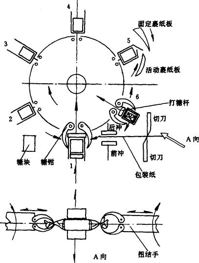 图2-4-16 钳盘结构 1-一工位 2-二工位 3-三工位 4-四工位 5-五工位 6-六工位 钳盘功能:糖块在理糖盘中定向后传送至钳盘第一工位,同时送纸机构也将纸送至相应位置,前、后冲机构配合将糖和纸一起夹住送入糖钳,并在完成半裹包后将其夹紧。钳盘转位到第五工位时,完成前后抄纸,第六工位进行双端扭结,并打糖排出。 |