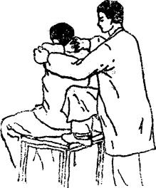 图3-22 颈部旋转定位扳法 (1)颈项部斜扳法:患者头部略向前屈。医生一手抵住患者头侧后部,另一手托住对侧下颏部,使头向一侧旋转至最大限度时,两手同时用力作相反方向的扳动(图3-17)。 (2)旋转定位扳法:患者坐位,颈前屈到某一需要的角度后,医生在其背后,用一手拇指按住患者某一颈椎棘突旁(向右扳则用左手拇指按住患椎右侧棘突旁,向左扳则用右手拇指按住患椎左侧棘突旁)其余四指扶住患者枕部,另一手托住对侧下颏部,同时把患者头部向患侧旋转至最大限度后,两手同时用力作相反方向的扳动(图3-22)。 2.胸背部扩胸牵引扳法:患者取坐位,令其两手交叉置于枕部,医生两手托住患者两肘部,并用一侧膝部顶住患者背部,嘱患者自行俯仰并配合深呼吸,作扩胸牵引扳动(图3-23)。