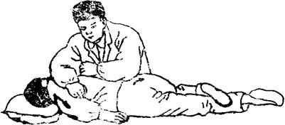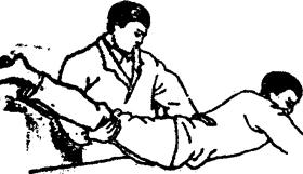 图3-25 弯腰旋转扳法 (3)腰部后冲扳法:患者腑卧位,医生一手托住患者两膝部,缓缓向上提起,另一手紧压在腰部患处,当腰后伸到最大限度时,两手同时用力作相反方向扳动(图3-26)。