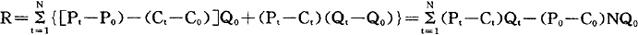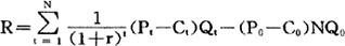 式中,P0、C0和Q0为技术引进前的产品价格、成本和销售量; Pt、Ct和Qt为合同期间(N年)的逐年的价格、成本和销售量。 以上计算公式都没有考虑货币收入或支出的时间价值。一年后的1元收入和今天的1元收入并不等值而是要少一些。换句话说,把1元钱存入银行,银行年息是5%,一年后这1元钱就变成了1.05元。因此在进行比较精确地计算时,应当对未来的收入按利率(r)贴现,其计算公式为:
