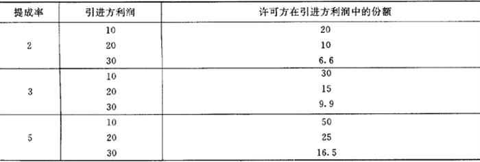 需要说明的是,在这里,许可方提出的引进方的利润额仅是一个假定的估算数额,许可方要承担估算的风险。 如果引进方认为许可方所占的利润分成率太高,要求许可方降到10%,那么,根据上述公式计算。引进方可要求将提成率降至3%。该3%提成的计算过程为: