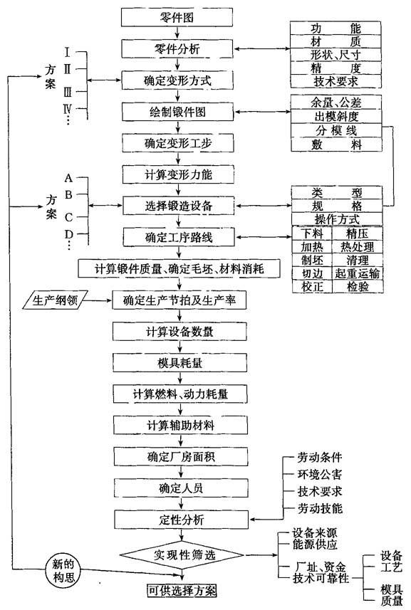 | 释义 | 技术经济分析步骤 8.5.3.1 工艺方案的分析 工艺分析是工艺方案的技术经济分析的首要和基础环节,工艺分析的目的是探寻、确定加工方法,为技术经济分析和选择最佳工艺方案准备条件.锻件工艺分析步骤如图8-51所示. 按图8-51所示步骤分析结果,可得到可选择的工艺方案,为技术经济分析打下基础. 在工艺分析过程中要特别注意锻造方法的选择.同一锻件可由多种方法锻造出来,但其经济效果有很大差别. 另外还要考虑锻件结构的经济性,注意锻件与零件的接近程度,这对零件生产经济性影响较大.锻件与零件的接近程度与工艺方法有关,与生产批量和总成本有关,如图8-52所示. 8.5.3.2 设备选用分析 锻件在实际生产中是多种设备的组合,某一个锻件可以在几个不同的设备上锻造出来.在选择设备时应按生产单位总成本最低的原则进行选择,其分析步骤用图8-53表示. 选用设备要特别注意经济效益,但也必须考虑实际情况.经济地选用设备应注意以下几个方面: 根据锻件变形特征,选择匹配设备;选用节能、劳动条件好、公害少、易操作设备.同时考虑在满足锻件质量和产量大小的前题下,选用工艺路线短、工序集中的设备;结合当时、当地的具体条件,得到最佳的选用方案. 8.5.3.3 能源与动力分析 锻造生产使用能源包括锻件毛坯加热用燃料和驱动设备,以及生产中必须消耗的能源. 动能源主要有电、蒸气、压缩空气、生产用水等. 我国目前能源紧张,与国民经济发展的需要有较大的矛盾.技术经济分析的主要目的就是节能,降低锻件生产成本. 目前减少燃耗的主要措施有:合理选择燃料、选择炉型及规格、余热利用、加强管理及先进锻件设计和工艺设计. 选择燃料要注意热效率.电加热的热效率最好,可达50%~60%;煤气加热热效率为20%;燃油加热热效率为7%;煤加热热效率只有5%,要结合实际情况综合考虑. 减少动力消耗的主要方法是选好节能锻造设备.随着技术不断发展,新设备越来越多,将会实现合理用能、节约能源的目的.同时要加强管理,防堵漏洞,建立有关制度.
