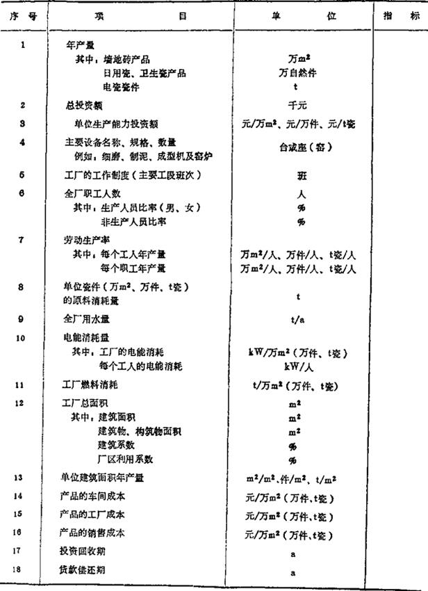 | 释义 | 技术经济指标内容 通常采用“技术经济指标表”,来评价陶瓷工厂设计上技术经济合理性及其综合技术经济效益的优劣。它们由一定程度上表征企业或车间“静态”经济性能(如面积、设备、固定资金等)和“动态”经济性能(如产量、流动资金、产品成本、投资回收期或贷款偿还期等)的各项指标有机构成完整的指标体系,并且具有一定可比性。表5-1给出了陶瓷工厂技术经济指标的各项内容。 表5-1 技术经济指标的各项内容